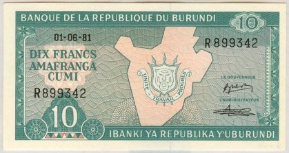 | En Büyük Şehir | : | Bujumbura | | Kurtuluş | : | 1 Temmuz 1962 (Belçika) | | Alan | : | 27.834 km2 (146. büyük) [%7,73 su] | | Nüfus | : | 10.304.520 (86. kalabalık) [Yoğunluk : 271 kişi/km2 (46. yoğun)] | | GSYİH | : | 2,772,000,000 USD (160. yüksek) [Kişi Başı : 735 USD (187. yüksek)] | | Zaman Dilimi | : | GMT+2 |